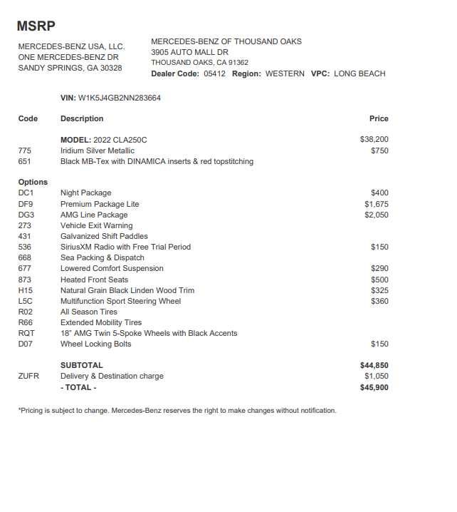 AMG® LINE AMG® sport pedals in brushed stainless steel w/rubber studs and diamond-block grille w/chrome pins and silver louvre w/inlays in chrome, Black Floor Mats w/AMG® Inscription, Black Headliner, AMG® Body Styling, Multifunction Sport Nappa Leather Steering Wheel, Sport Seats w/Fixed Head Restraints, PREMIUM PACKAGE LITE 10.25 Media Display w/Touchscreen, Power Folding Side Mirrors, 10.25 Digital Instrument Cluster, Auto-Dimming Rearview & Driver-Side Mirrors, HEATED FRONT SEATS, NATURAL GRAIN BLACK LINDEN WOOD TRIM, Sunroof, Panoramic Roof, Back-Up Camera, Turbocharged, iPod/MP3 Input Exchange Privilege for 7 days or 500 miles, whichever comes first, Each Certified vehicle must pass a rigorous inspection of over 165 points, 24-Hour Roadside Assistance includes trip routing, trip interruption coverage and technical help, A network of over 300 Mercedes-Benz dealers will support your Certified Mercedes-Benz, Carfax Vehicle History Report, Balance of New Car Warranty plus 1 year/unlimited miles extended Limited Warranty Mercedes-Benz of Thousand Oaks is your local Mercedes-Benz dealership, serving the Thousand Oaks and Los Angeles Metro area since 1982. Our showroom always includes the most current luxurious and sophisticated Mercedes-Benz models. Were only a short trip from many communities, including Malibu and Simi Valley, and our team is happy to provide sales, financing, and automotive service and repair on site.