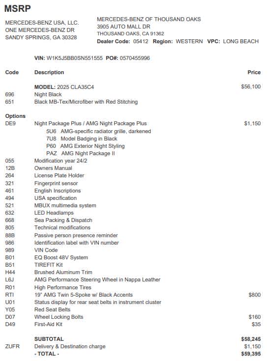 Step into the exhilarating world of the 2025 Mercedes-Benz AMG® CLA 35, where high-octane performance meets laid-back SoCal sophistication in a stunning package. As you slide into the heated driver seat, the cabin envelops you in luxury, setting the stage for an unforgettable driving experience. The panoramic roof invites the golden California sun to pour in, enhancing your journey as you cruise along the coast or weave through vibrant neighborhoods. With the AMG® Night Package Plus, every detail is designed to captivate, from the high-gloss black exterior mirror housing to the AMG®-Specific Radiator Grille that commands attention. The 19 AMG® twin 5-spoke wheels with black accents grip the road with confidence, ensuring that every turn is met with precision and agility. The back-up camera provides peace of mind as you maneuver through tight spaces, while the full-time all-wheel drive system guarantees that no terrain is off-limits. The chrome-plated tailpipe trim in black adds a touch of bold elegance, making a statement wherever you go. This CLA 35 is not just a car; its a declaration of your passion for performance and style. Ready to elevate your driving experience? Visit us today and let the 2025 Mercedes-Benz AMG® CLA 35 take you on a journey where luxury and exhilaration collide.