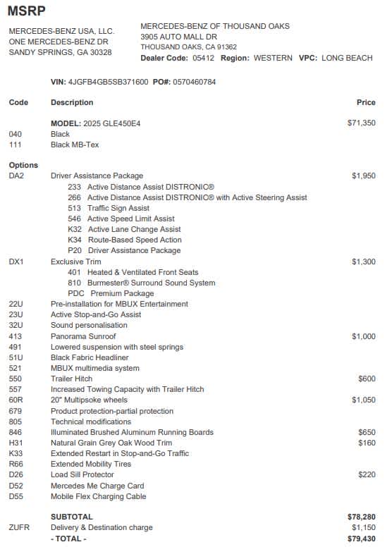 DRIVER ASSISTANCE PACKAGE Active Lane Keeping Assist, Active Distance Assist DISTRONIC®, Active Steering Assist, Active Speed Limit Assist, Extended Restart in Stop & Go Traffic, Active Lane Change Assist, Route-Based Speed Adaptation, EXCLUSIVE TRIM Ventilated Front Seats, Burmester® Surround Sound System w/Dolby Atmos, 13 high-performance speakers, 9-channel DSP amplifier w/590-watts output and Frontbass, Music Streaming, Sound Personalization, WHEELS: 20 10-SPOKE Tires: 275/50R20, PANORAMA POWER TILT/SLIDING SUNROOF, ILLUMINATED RUNNING BOARDS, TRAILER HITCH Increased Towing Capacity, NATURAL GRAIN GREY OAK TRIM, Navigation, Full-Time 4MATIC® All-Wheel, Power Liftgate, Back-Up Camera, iPod/MP3 Input SPC Mercedes-Benz of Thousand Oaks is your local Mercedes-Benz dealership, serving the Thousand Oaks and Los Angeles Metro area since 1982. Our showroom always includes the most current luxurious and sophisticated Mercedes-Benz models. Were only a short trip from many communities, including Malibu and Simi Valley, and our team is happy to provide sales, financing, and automotive service and repair on site.